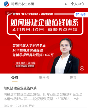 4月8日-4月10日,公司組織業務部門參加了由國內知名投資機構明德資本分享的“如何搭建企業值錢體系”的線上直播課程,明德資本投資總監鄭煒茹用專業的投資邏輯跟學員們分享了企業在資本運作過程中所涉及的股權融資策略、如何估值、上市前的準備工作等干貨內容。